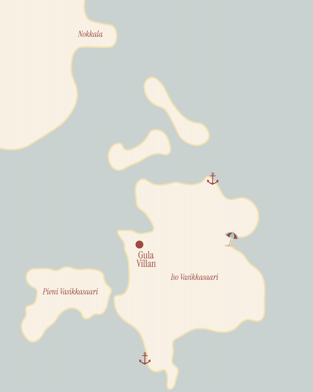 Gula Villan sijaitsee kauniilla Iso Vasikkasaaressa Espoon edustalla – jo matka meille on osa elämystä.